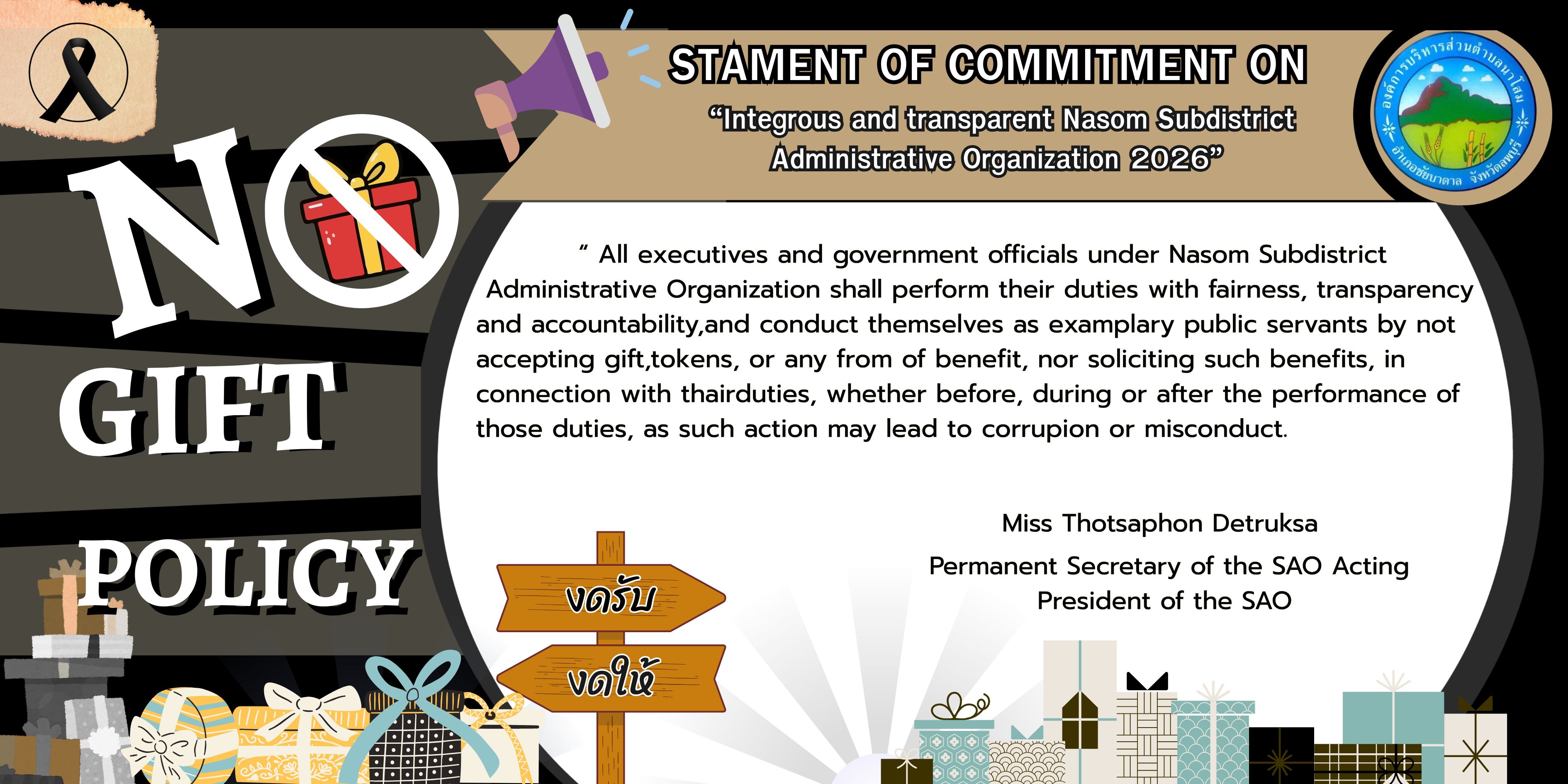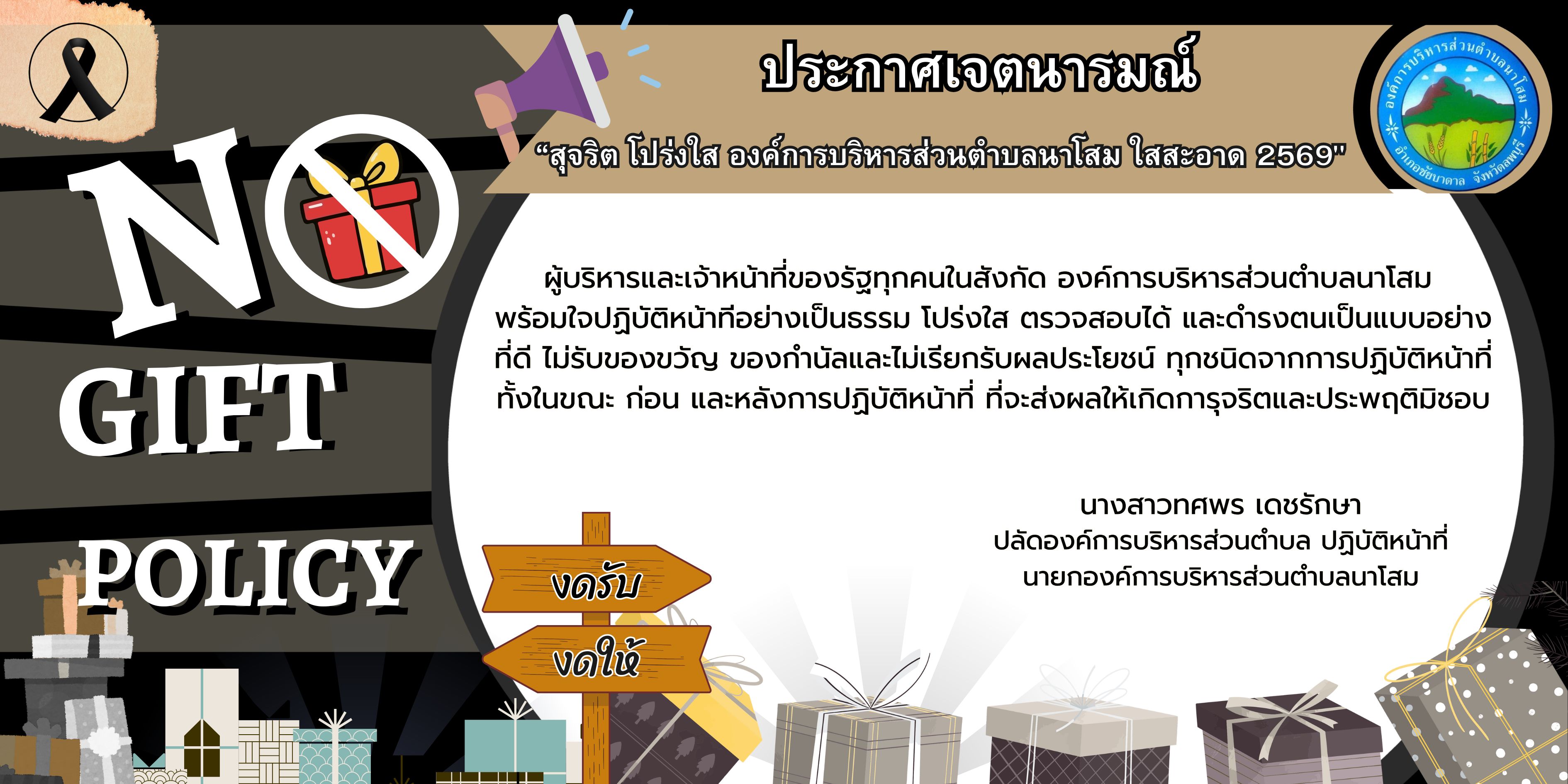 ประกาศเจตนารมณ์ เรื่อง "สุจริต โปร่งใส องค์การบริหารส่วนตำบลนาโสม ใสสะอาด ๒๕๖๙" และ "งดรับ งดให้" ของขวัญ ของกำนัลทุกชนิดจากการปฏิบัติหน้าที่ (No Gift Policy)